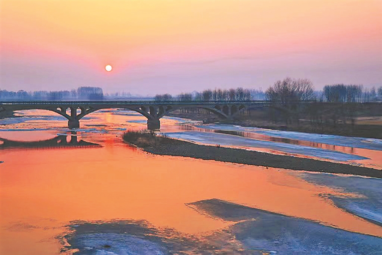 一輪初升的紅日,一縷早春的陽光,映在海浪河冰雪初融的河面上,河面充滿了厚重的質(zhì)感,河上的大橋也被染得金碧輝煌。沉寂了整整一個冬天的河面,又有了生命的脈動。